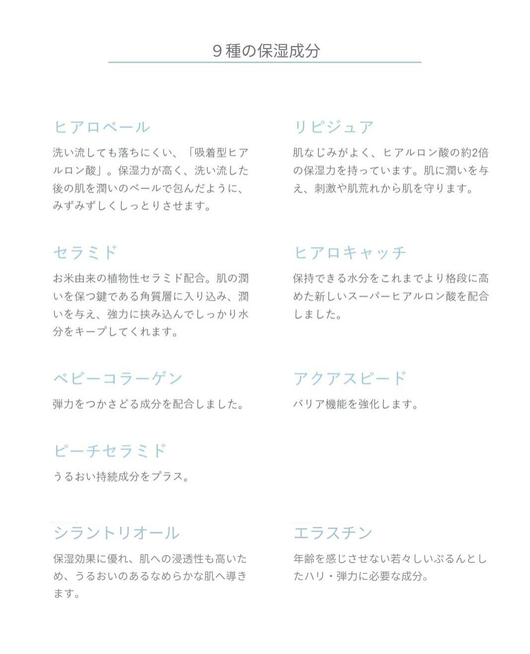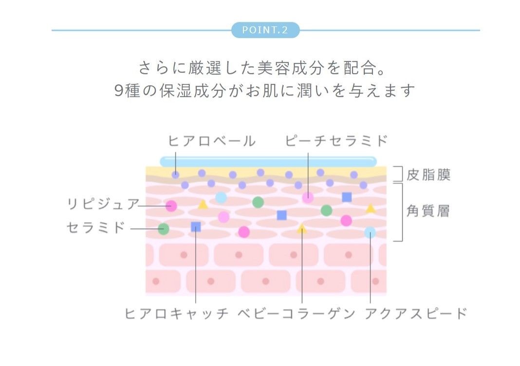 水、グリセリン、シリカ、カオリン、BG、ベントナイト、アルミナ、酸化鉄、ヒアルロン酸ヒドロキシプロピルトリモニウム、カルボキシメチルヒアルロン酸Na、加水分解ヒアルロン酸、ヒアルロン酸、加水分解エラスチン、パルミトイルペンタペプチド-4、パルミトイルトリペプチド-38、シラントリオール、スイカ果実エキス、リンゴ果実エキス、ヒラマメ果実エキス、フィトステリルグルコシド/グルコシルセラミド、グルコシルセラミド、サクシノイルアテロコラーゲン、ポリクオタニウム-51、PCA-Na、α-グルカン、ラウロイルグルタミン酸ジ(フィトステリル/オクチルドデシル)、キサンタンガム、酸化亜鉛、グリチルリチン酸2K、乳酸Na、オレイン酸Na、ラウリン酸ポリグリセリル-5、ポリソルベート20、ヒドロキシプロピルシクロデキストリン、クエン酸、カルボマー、メチルプロパンジオール、1,2-ヘキサンジオール、フェノキシエタノール、メチルパラベン、プロピルパラベン