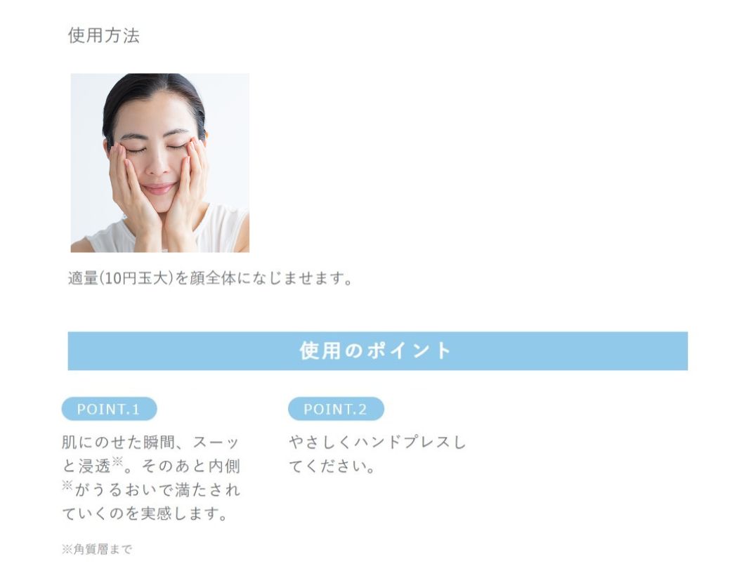 水、グリセリン、BG、ベタイン、1,2‐ヘキサンジオール、加水分解ヒアルロン酸アルキル(C12‐13)グリセリル、ヒアルロン酸ヒドロキシプロピルトリモニウム、加水分解ヒアルロン酸、ヒアルロン酸Na、グルコシルセラミド、ソルビトール、セリン、グリシン、グルタミン酸、アラニン、リシン、アルギニン、トレオニン、プロリン、α‐グルカンオリゴサッカリド、エーデルワイスカルス培養エキス、グリコシルトレハロース、グリセリルグルコシド、チューベロース多糖体、加水分解水添デンプン、グリチルリチン酸2K、PCA‐Na、ポリクオタニウム‐39、(スチレン/アクリレーツ)コポリマー、ヒドロキシエチルセルロース、α‐グルカン、キサンタンガム、フェノキシエタノール、エタノール